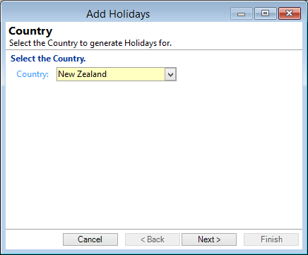 From the dropdown list, select the Country and State (if applicable) to automatically generate Holidays for.